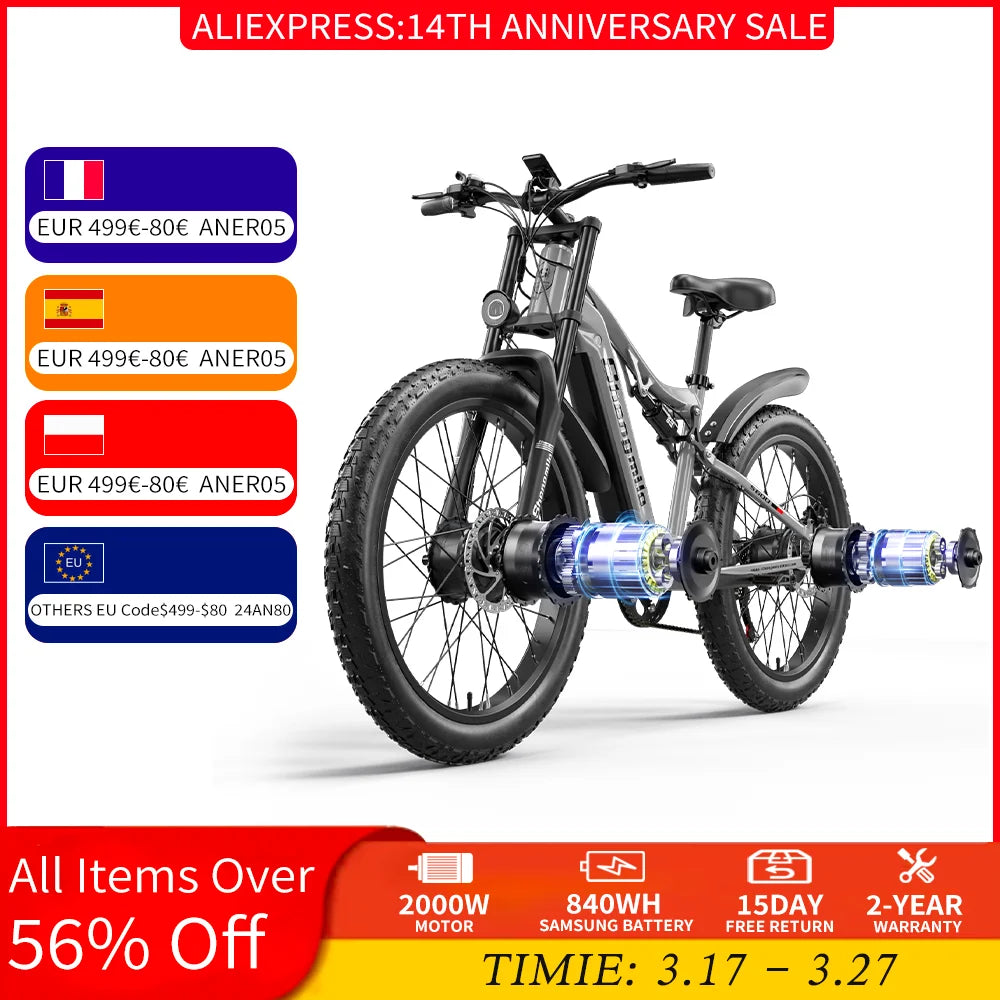 Shengmilo S600 Dual Motor Electric Mountain Bike - 2000W, 48V17.5AH Battery, 26 Inch Fat Tire, Shimano 7-Speed, Full Suspension Men's e-Bike