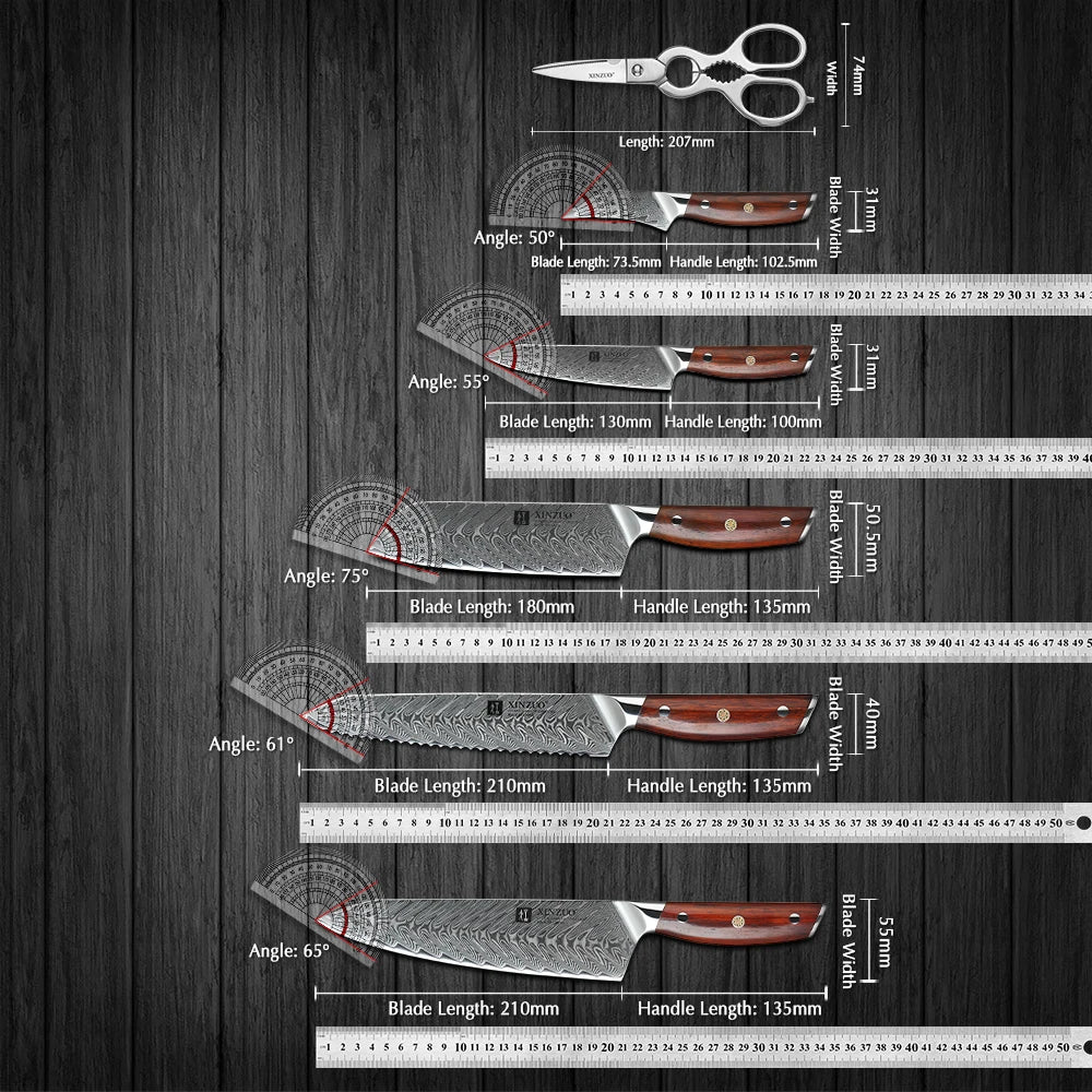 XINZUO 7PCS Kitchen Knives Sets Damascus Steel Chef Knife Sets Stainless Steel Kitchen Scissors Acacia Wood Knife Block Holder